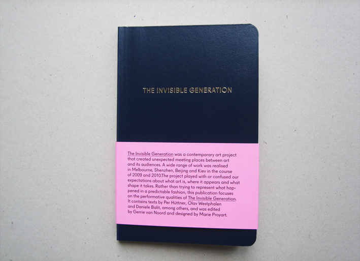 The Invisible Generation is the title of a series of projects that appeared in different guises in the cities of Beijing, Melbourne, Kiev and Shenzhen in 2009–2010, inspired by a text by William S. Burroughs carrying the same title. One of the key premises was to create situations for art and its audiences to meet at unexpected moments, in unexpected places, in unexpected ways. The Invisible Generation was part of Vision Forum and initiated by Per Hüttner and Daniele Balit.