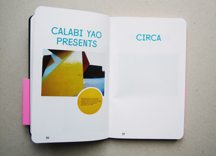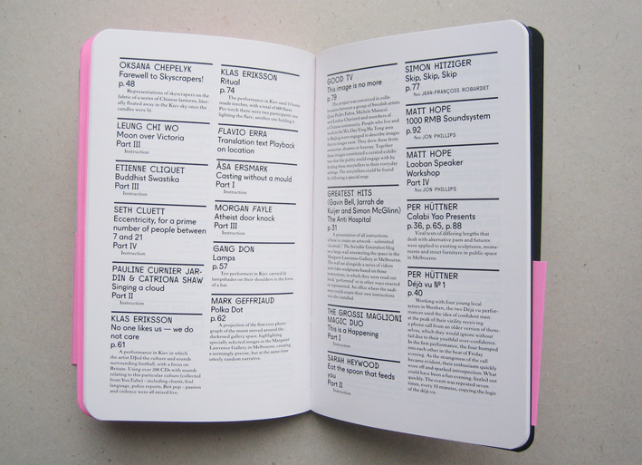 This led me to suggest to shift the emphasis of what we would try and cover towards the ideas underlying the diverse works, and rather than focus on what they looked like consider where they came from, so to speak. This in turn suggested that Marie and I could take the liberty to actively question and play with issues around mediation and translation instead of trying to ‘solve’ them. Some ‘solutions’, or, in traditional terms, ‘non-solutions’ resulted in quirky elements: there are some blank pages, for instance, for projects where we felt an image would not serve any purpose (Marie’s idea; why didn’t I think of that?!) We embraced actively toying with notions of access by having two different indices and using screenshots of the project’s Wikipage as the introduction (rather than rehashing it into a properly laid out edited text). Per literally pushed me to formulate my thinking around the process by way of contributing a text in three parts. And instead of a traditional blurb printed on the back cover, the book literally wears a description of what to expect on its sleeve; a little band wrapped around itself as object.