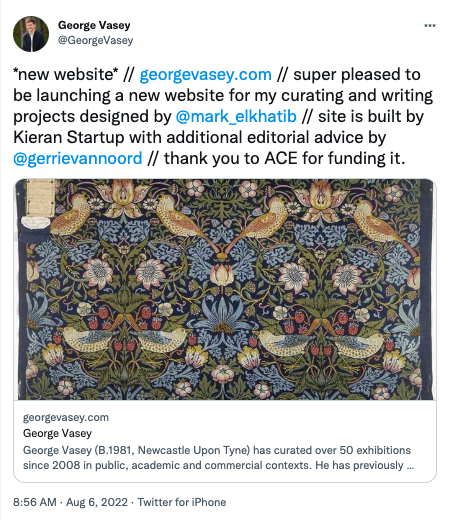 Having worked as an editor on Olivia Plender’s website, which went live almost a year ago, I recently contributed to another site that went public earlier this month – curator George Vasey’s. This time my involvement was much less direct and intensive: in 2021 George approached me whether I’d be interested in having a series of conversations with him because he was taking stock as to where he was as a practising curator and how to make the range of work that he had done so far visible or accessible in some shape or form. And because he also writes for various platforms and was thinking about expanding his practice in slightly different directions, he wondered whether I would be willing to be a sounding board in thinking through how to present his different activities in a way that would be versatile, exciting and relatively near-future proof.