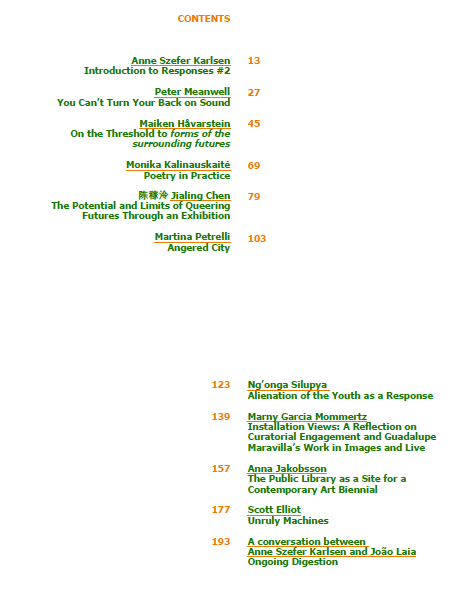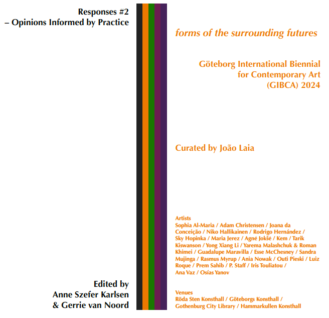 Having worked with the students of the MA Curatorial Practice at the University of Bergen before, course director Anne Szefer Karlsen invited me again to co-edit texts for a publication in which they each individually respond to the same exhibition, titled Responses # 2 – Opinions Informed by Practice. While the previous iteration, Responses #1 (2022), comprised a range of different approaches to writing following a collective visit to a solo exhibition, this time authors each wrote a text in response to the Göteborg International Biennial (GIBCA) 2023 curated by João Laia.