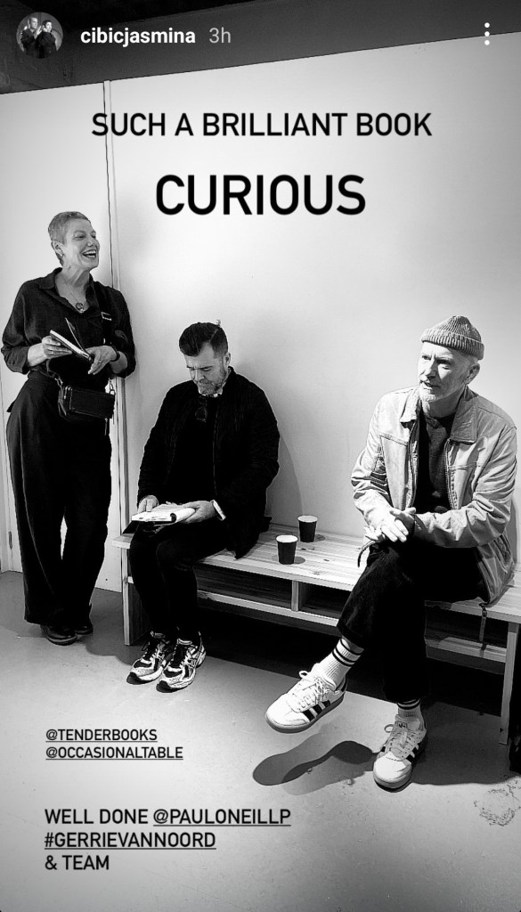 In keeping with the colour scheme of the book – a black cover with white type – below an ‘action shot’ captured by artist Jasmina Cibic, who posted this on Instagram.