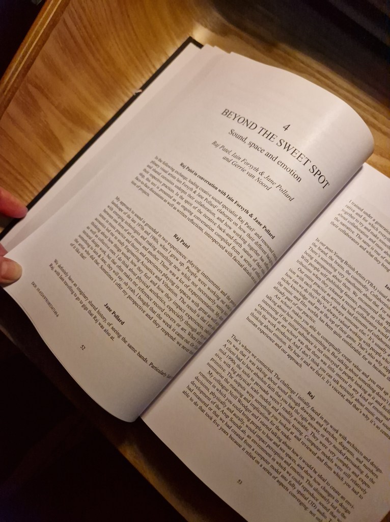Between an initial zoom meeting and a day spent talking and listening, and listening and talking at Arup’s SoundLab in London, we ended up with a rich meandering set of fragments in which Iain & Jane and Raj reflected on very different but also some related projects. A recurring topic was the development of new technologies and the testing of their limits, or as Iain puts it ‘there is a kind of natural impulse to want to break things, to creatively tear things down to make something new. That is what makes making art exciting for me. If I smash it to pieces, what canI turn it into? Not that I’m suggesting smashing up the SoundLab, but metaphorically.’ The final text, titled ‘Beyond the sweet spot: Sound, space and emotion’ – derived from an anecdote about working with Scott Walker on Bish Bosh: Ambisymphonic – has ended up among a raft of other contributions to this hefty hardback, though luckily there is a – much more affordable – e-book version, and the book is also partial open access.