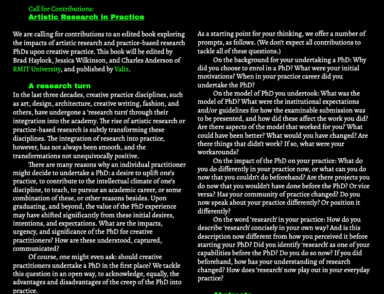 In 2023 I spotted a call for papers, jointly issued by Valiz, an Amsterdam-based publisher that I’ve been following for years, and RMIT in Melbourne. The call was for abstracts for contributions to an anthology about practice-based PhDs across a range of fields. For the full brief, see the images below and the website here.