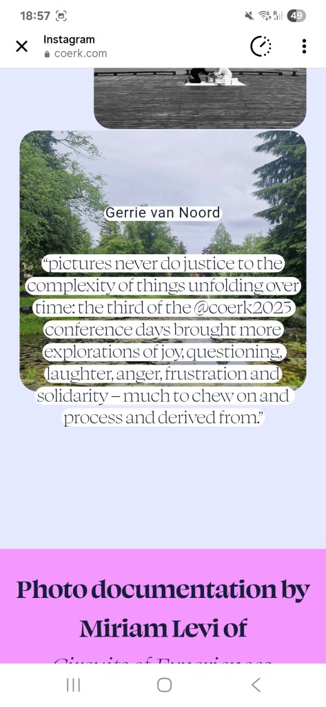 In late June I attended the “Circuits of Experiences, Research and Knowledges” gathering in Bergen, Norway, organised by the indomitable Anne Szefer Karlsen, with whom I’ve worked on a range of publication projects. The conference was organised to mark the end of the MA Curatorial Practice, instigated by Anne ten years earlier, in which five widely dispersed and positioned cohorts took part and to which I contributed (see my posts on Responses #2 and Responses #1). However, it also highlighted that coming together, being together and working together, to paraphrase Maria Lind, can also be a very celebratory and productive event – highlighting resonances and affinities, strengthening connections and relationships, and contributing to a self-reflexive approach to one’s own practice.